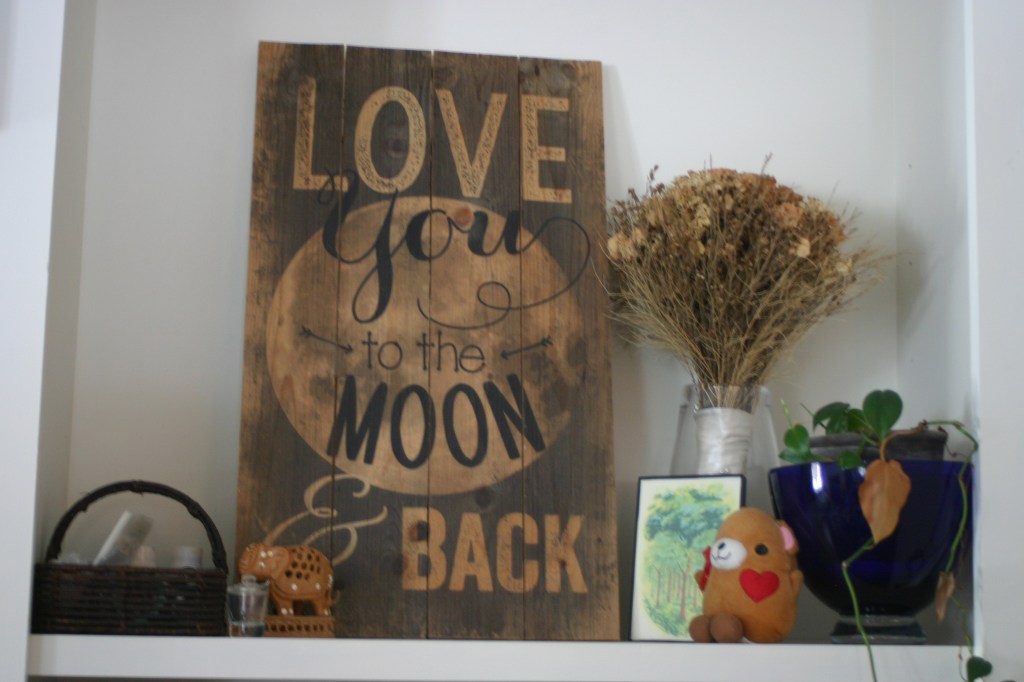 From left to right, a small basket of writing supplies, a carved elephant from a friend, a distressed wood sign, my bouquet from our wedding, Lovey Bear stuffed animal, and a struggling house plant.